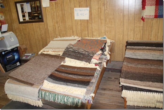 Reinhard has a catalog of designs to be woven into the rugs. and the rugs are made on special order for the customers who send their fleece, but he also has rugs made from the remnants of yarn left over which are for sale to people who just show up. On this visit there weren’t many remnants on display for sale, but that changes all the time. Remnants are also made into saddle blankets, which Reinhard said are good sellers. Customers can order a custom rug that will also be made out of remnant yarn, but you might have to wait a while for it to materialize. It would be worth the wait.