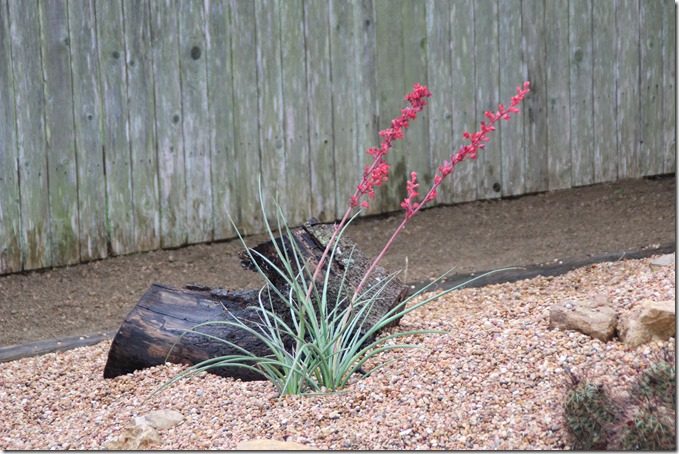 We could have used more plants, but Kelly also wanted to keep things simple and leave space for additions later on if the mood strikes her, so while you may think the garden looks empty, keep in mind the plants were spaced with growth in mind and allowing for others to be added. I had color in mind when choosing purple iris, brake light red yucca, yellow, red, and purple ice plant, blue Russian sage for height and color at the back of the center bed, while keeping the yellow and red lantana she already had. The crape myrtles will add color when they bloom, but I forgot to ask what color their blooms will be! She has a golden barrel cactus and a Texas barrel cactus that will eventually bloom as they get larger, and a hedgehog claret cup cactus that will bloom bright red for her next spring. Whale’s tongue, artichoke, and harvardiana agaves will grow and fill in while adding structural patterns and interest in the garden.I included two succulents, string of pearls-senecio rowleyanus- and ghost plant graptopetalum because they are good succulents for accent plants. A variety of hens and chicks will also spread and add a nice contrast to the other succulents in the garden. She has a nice variety that should meet her low maintenance and water requirements.