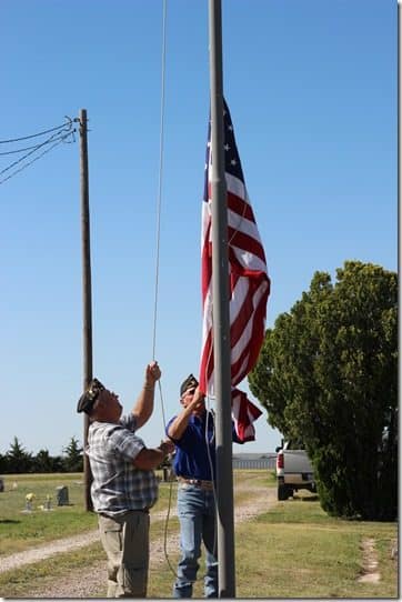 We drove out to the Bailey County Cemetery this morning (May 29) for the annual observance of Memorial Day hosted by the Bailey County Cemetery Association. David Wyer, who always helps organize the program, introduced Jerry Bruton, president of the association, who served as the master of ceremonies this year. After welcoming the visitors, he and Basil Nash began the service by raising the flag, then lowering it to half-staff in honor of our fallen American soldiers, and Madison Tyler from Friona played the National Anthem on her violin while the audience stood in respectful and appreciative silence.