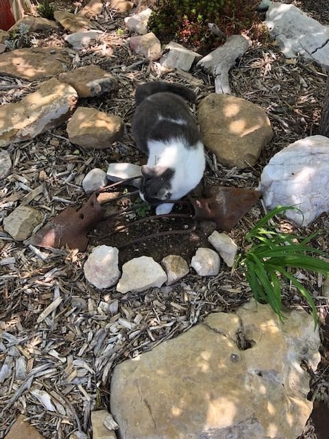 So I dug into the rusty things I have for decorating the garden and came up with a combination of plow shears and pitchfork tines, along with a few rocks, to try to protect the plant from the cats. I watered and waited and it came back again. But when I would water it, the plow shears would be all askew, and it was obvious someone was still trying to enjoy the plant. I would reset the protection, water, and the process would start over. But I never could catch any of the cats attacking the plant.