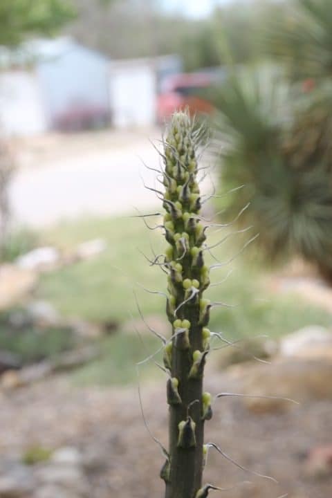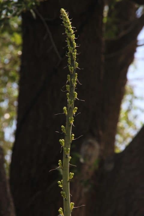 You can see in the pictures above and below that just like other agaves, the flowers at the bottom open first and dry up as the cycle continues up the mast. The flowers to the left in the picture below have not dried yet, but you can see the difference in them and the ones higher up on the mast that have not been open as long.