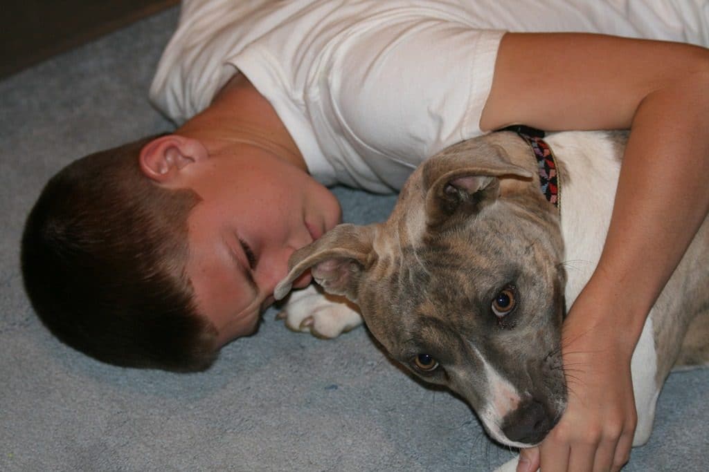 We thought she was a pit bull, but later found out she was a Staffordshire bull terrier, a somewhat smaller but equally compact and strong dog with a mouthful of teeth and a huge capacity for loyalty, companionship, and love, which is what led her back to our house right soon after Colten brought her home. He and his mother, our daughter Caroline, were living just around the corner in the next block, just two houses away. Colten would go to school, Caroline would go to work, and Mari was stuck in the back yard all day alone. She had been to our house a few times with Colten, enough to know where we lived. I looked out the window one day, and here she came, just as fast as her three legs would take her, down the road and up our drive-way! She had figured a way out of her fenced back yard and came here looking for family. It came to pass pretty quickly that she wound up living with us and became our dog, too.