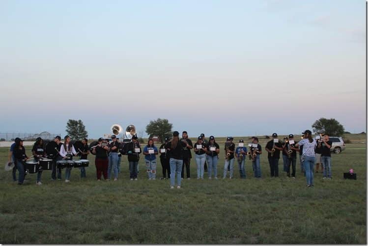 About 8 o’clock the Mules black and white game bus came through with the band and color guard.