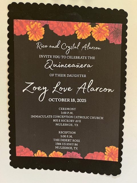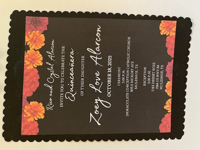 I had the pleasure of attending the Quinceanera of Zoey Love Alarcon. Her fifteenth birthday was October 8. Her Quinceanera was October 18. Zoey’s parents, Rico and Crystal Alarcon, marked her entrance into adult life with the religious ceremony making it official at the Immaculate Conception Catholic Church in Muleshoe, and then celebrated afterward with a reception at the Desert Rose event center, also in Muleshoe.