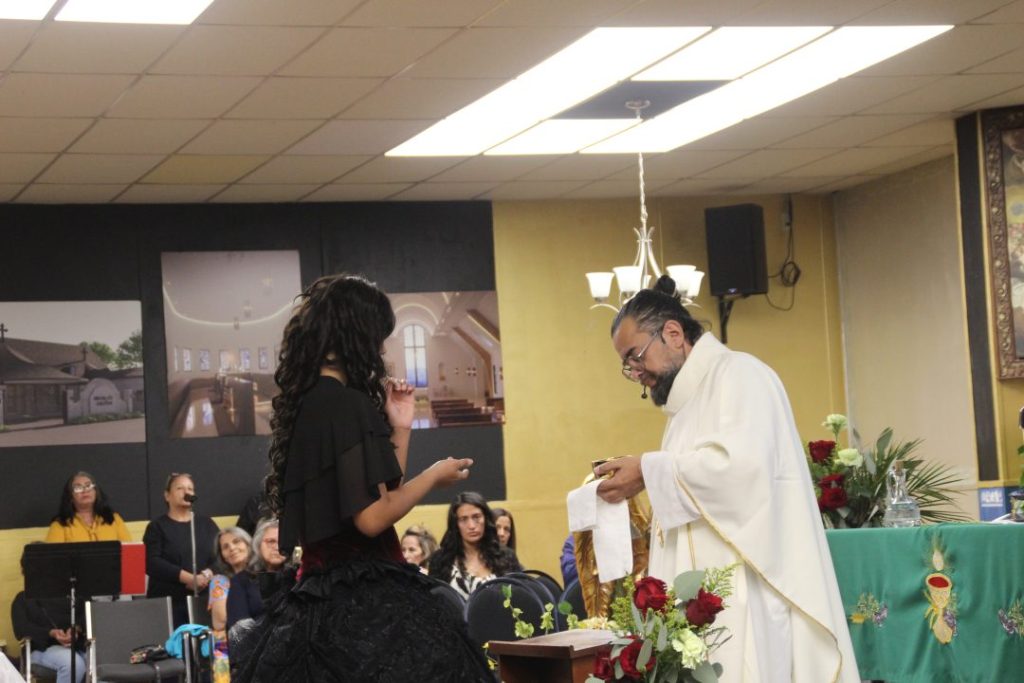 Father Nahun blessed Zoey, after which Zoey’s grandmother, Angela Reyes, and Angela’s sister, Zoey’s aunt, Nicky Orozco, read appropriate scripture passages that were chosen by Crystal and Rico from the books of Jeremiah and John. Father Nahun then gave a homily and asked Zoey, Crystal, and Rico what they wanted Zoey to gain from God as well as the rituals and values presented in the Quinceanera. I am not quoting exactly, but Crystal mentioned life everlasting for Zoey, Rico wanted Zoey to grow in her faith, and Zoey said this would be a step toward eternal life and was looking forward to support from God, family, and friends.