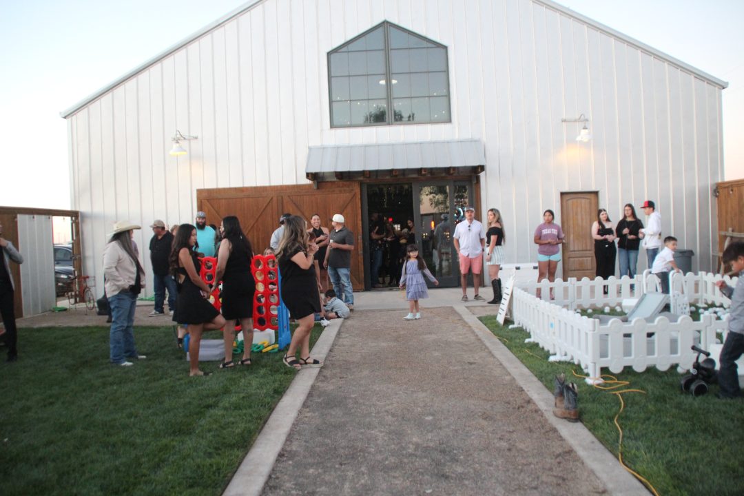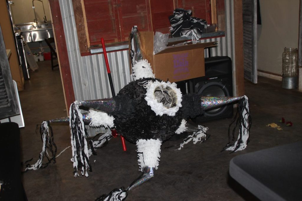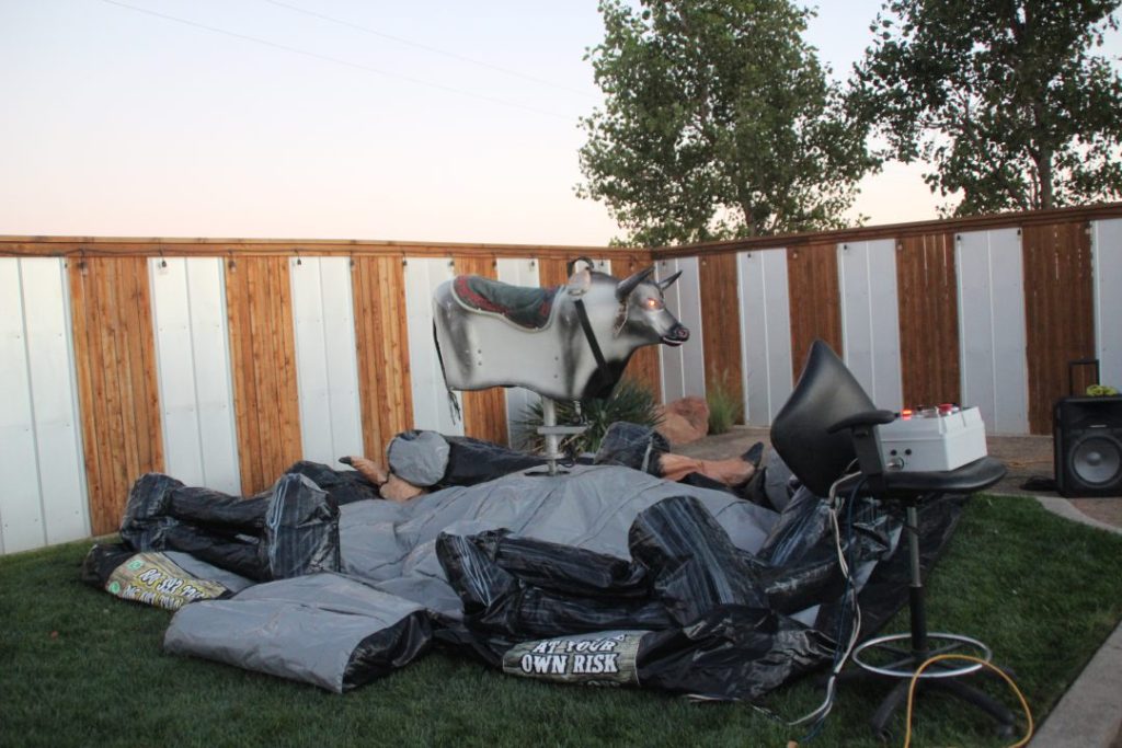 I wandered to the lawn in the back of the building where activities had been set up for fun. Kids were playing in a little playground, adults and kids were playing cornhole and had ridden the mechanical bull to the point that a breaker had been flipped, so all I got was a picture of the bull at rest. Later, a piñata had been hung up for the little guests to attack, and I missed that, but I did get a picture of the second piñata that would be hung up later for Zoey’s classmates and brother who had missed the first part of the night while competing with the MHS band in marching competition in Lubbock. As it turns out, they placed first and will be going on to regional competition next.