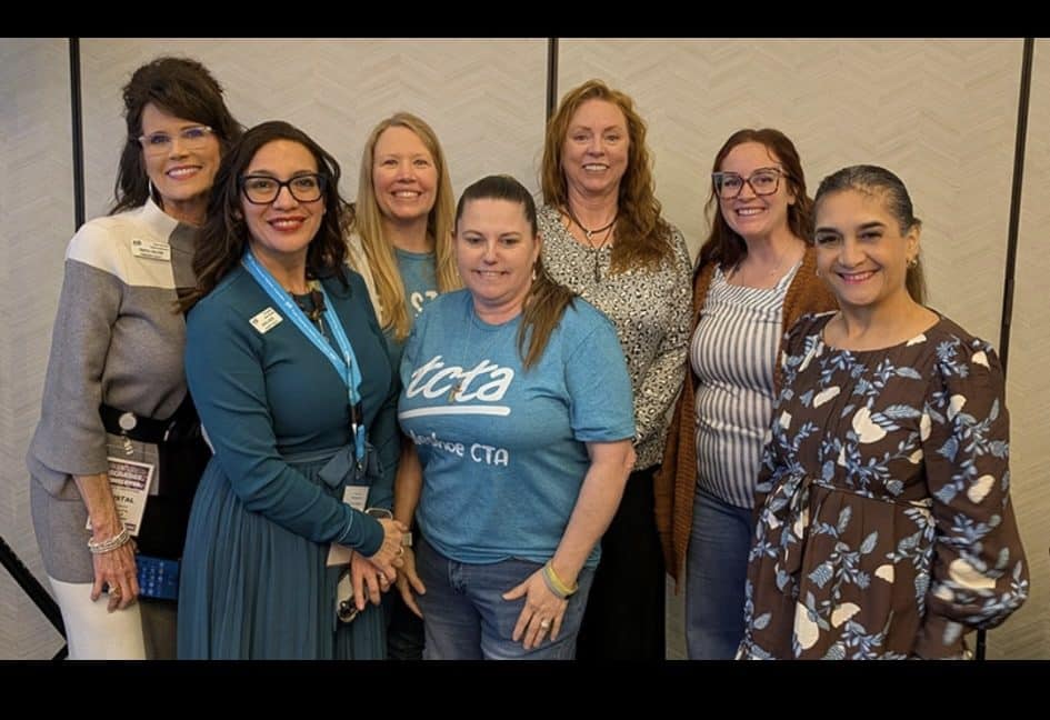 The Region 17 directors gathered for this picture before leaving convention. In the back row we have Cristal Isaacks from Levelland, which is in Region 17, and will lead TCTA next year as state president; Amanda Coffman is from Cooper High School, Leigh Handlin is from Lubbock ISD, Charly Smith is also from Cooper ISD. In the front row is Angela, Keri Frost from Muleshoe, Maria Lara from Lubbock ISD. Bruce Finch from Slaton is also a Region 17 director but had to leave early before the picture was taken.